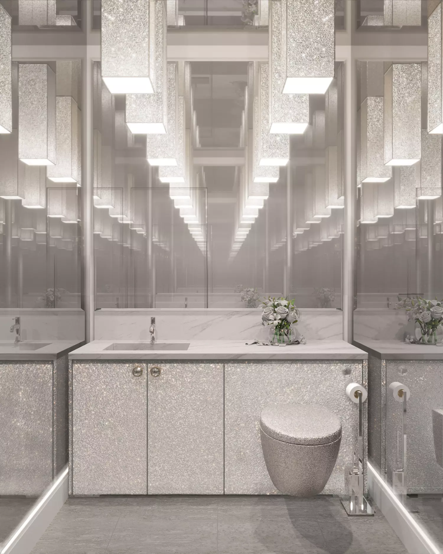 Например в интерьере гостиной, уборной комнаты для гостей, холла использованы стразы Swarovski, стены шкафа спальной главы семьи декорированы перьями. Мебель кухни, гостевого WC, светильники гостевого WC, шкафы сделаны на заказ по моему дизайну.